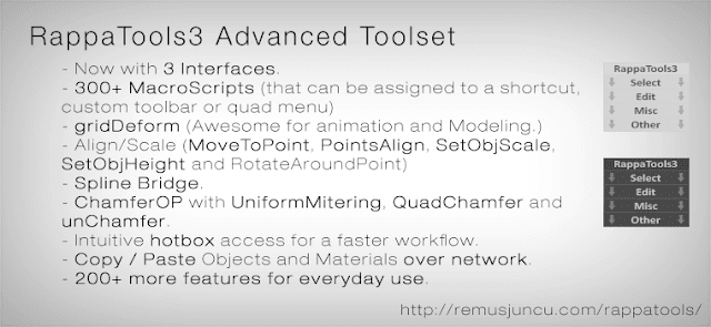 RappaTools3 es un conjunto de herramientas avanzadas que viene con una gran variedad de herramientas para el artista que trabaja en 3ds Max. El objetivo principal es el de acelerar el flujo de trabajo y para reducir el recuento clic. Ofrece una amplia variedad de herramientas, todo, desde herramientas de selección para herramientas de renderizado. Puede ayudarle a través de todo el proceso de creación de una obra de arte en 3D.